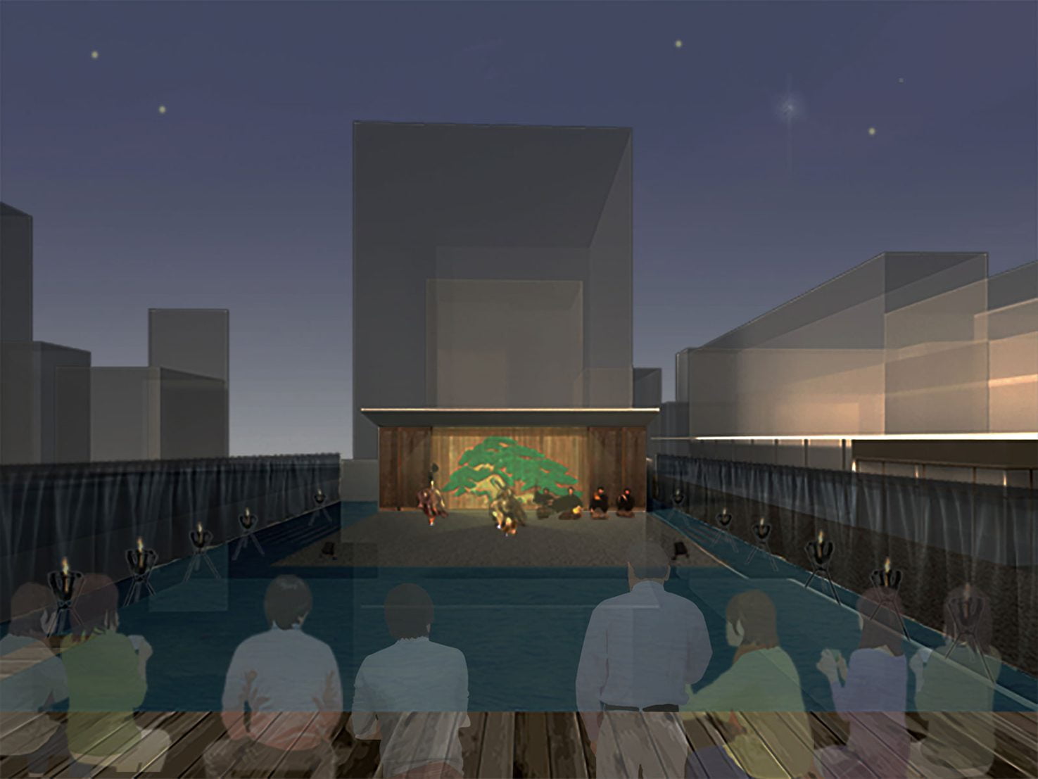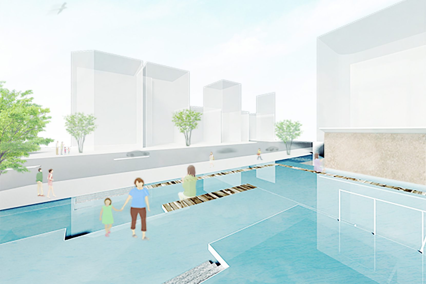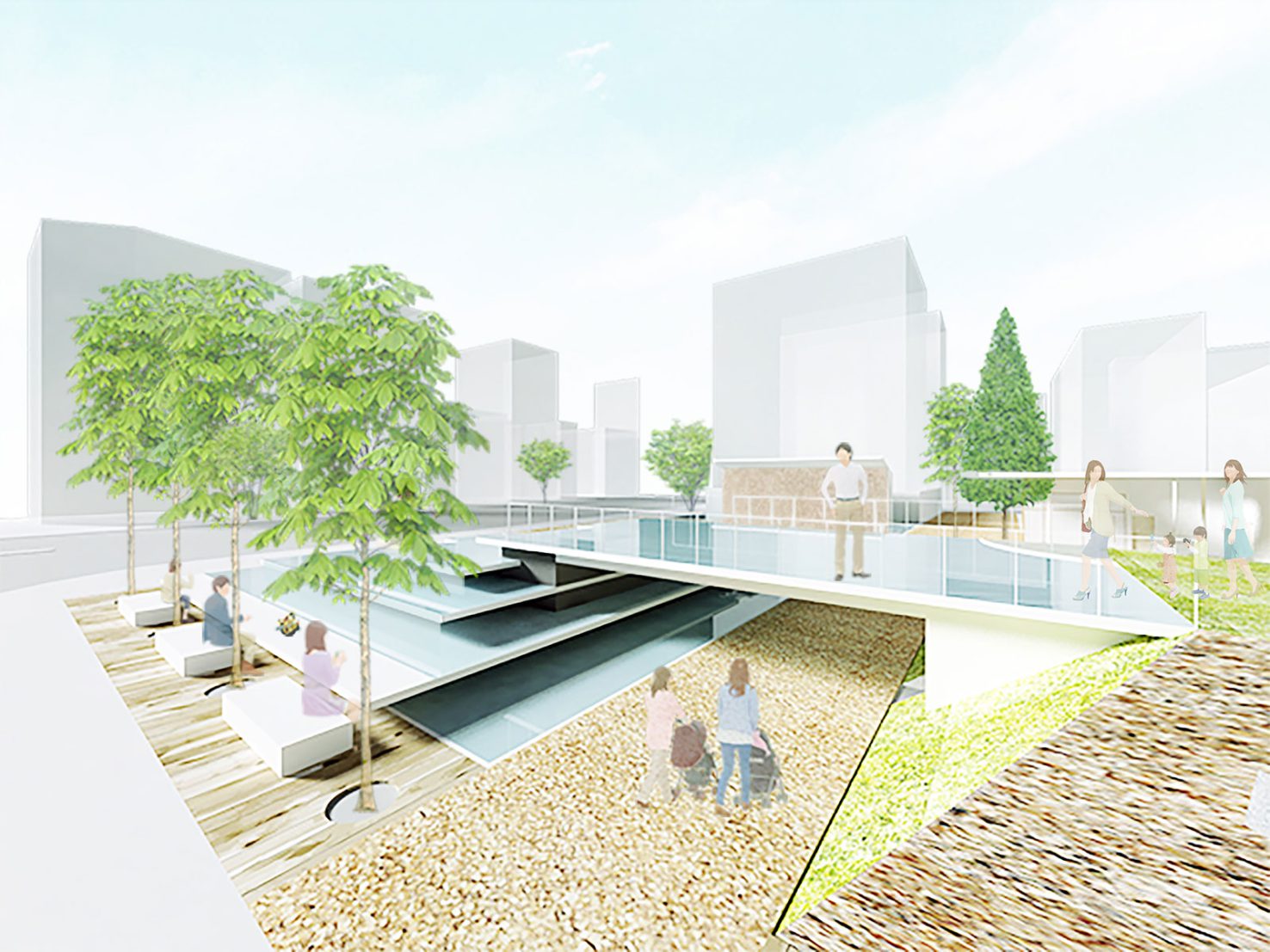 大分市中心市街地祝祭広場整備事業のプロポーザルに提案した計画案。大分駅前の一等地の場所に祝祭広場を整備するということで、イベント時に桟敷席に転換する立体水盤と、日常の憩いをつくる芝生の丘、広場を支える背景として機能する縁側テラスのある建築を整備することを提案し、最終5社に選定。