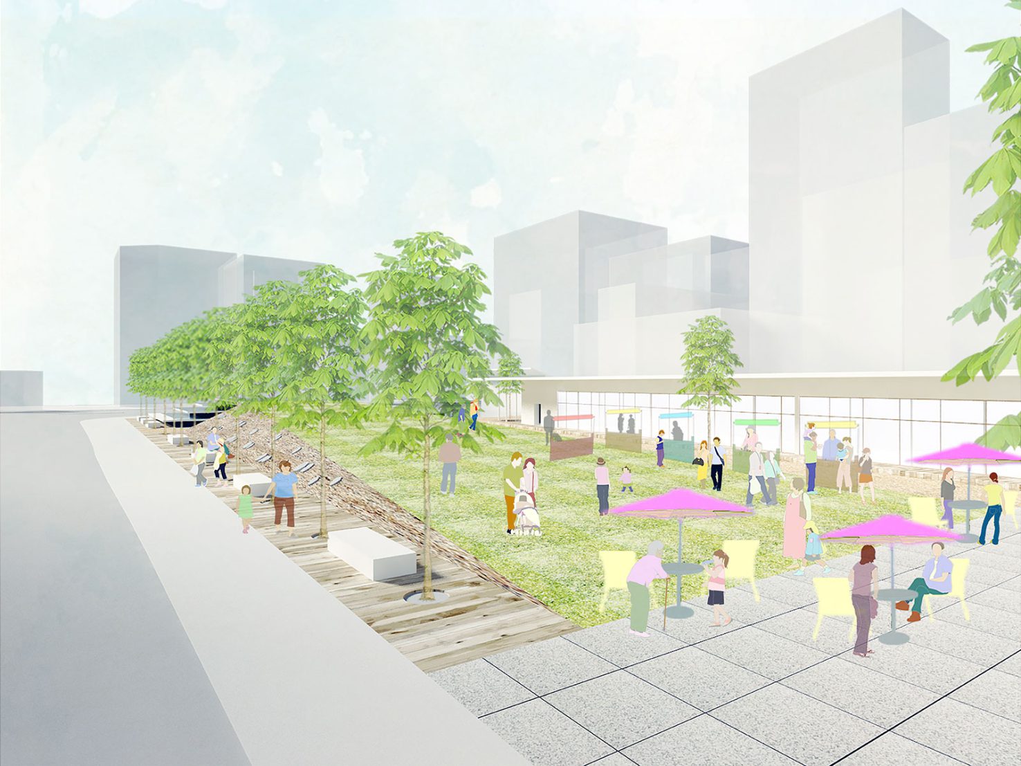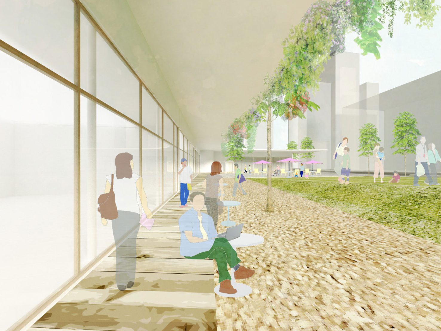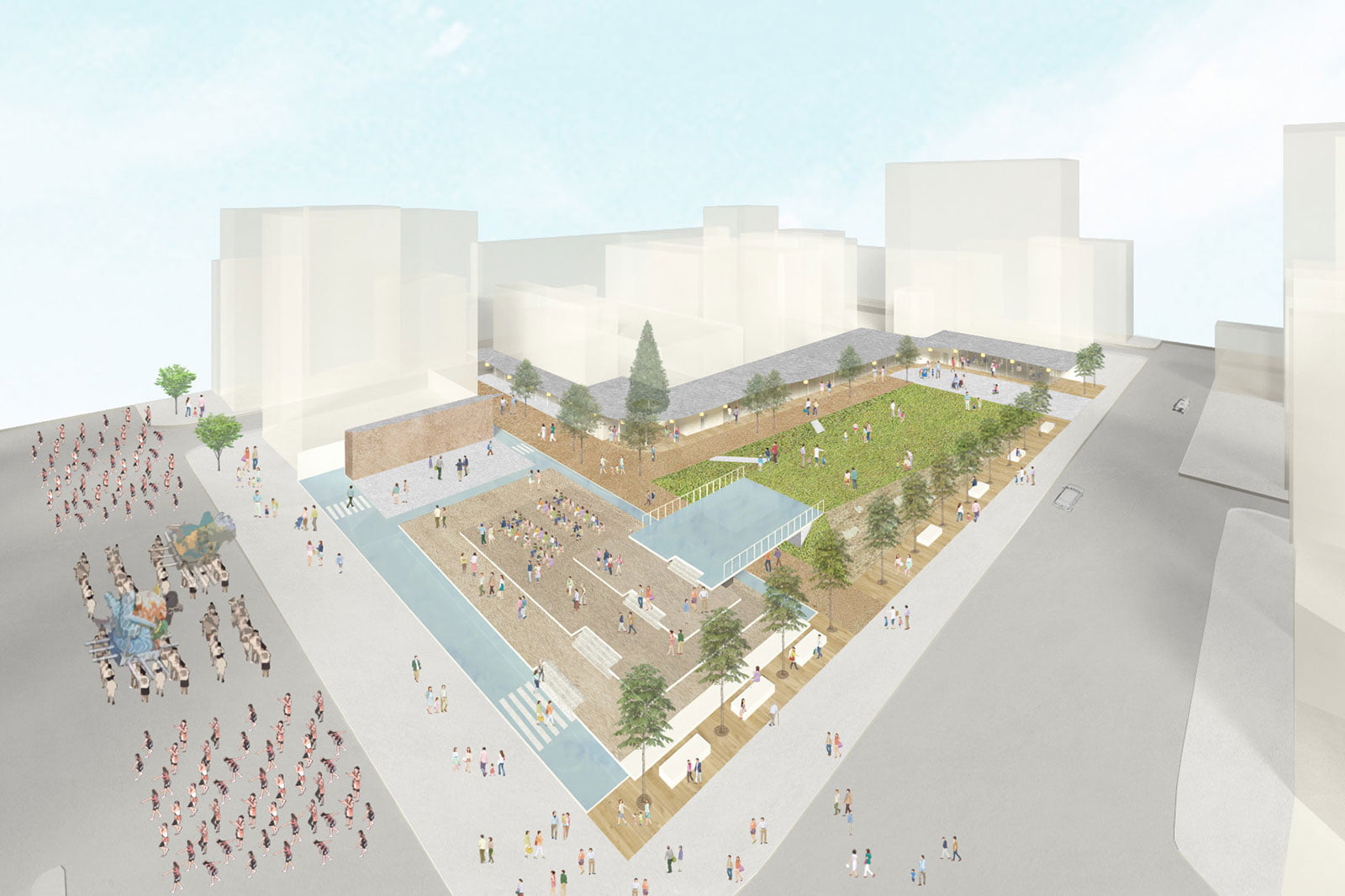 大分市中心市街地祝祭広場整備事業のプロポーザルに提案した計画案。大分駅前の一等地の場所に祝祭広場を整備するということで、イベント時に桟敷席に転換する立体水盤と、日常の憩いをつくる芝生の丘、広場を支える背景として機能する縁側テラスのある建築を整備することを提案し、最終5社に選定。
